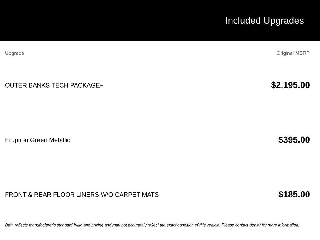 EVERY VEHICLE WE SELL COMES WITH A 5 day or 500 mile 100% money back guarantee. Not completely satisfied? No problem! Bring the car back for a for a full refund.. No questions asked. *New vehicles come with a Lifetime Limited Powertrain Warranty at NO COST to you!* (Not available on Commercial vehicles). Factory MSRP: $41,565 Dealer Discount of $1,285 off MSRP $3,285 off MSRP! Automatic temperature control, B&O Sound System by Bang & Olufsen, Connected Navigation, Equipment Group 300A, Front & Rear Floor Liners w/o Carpet Mats, Front Driver/Passenger Seat Back Map Pockets, Front dual zone A/C, Front Parking Sensors, HD Radio, Heated door mirrors, Heated front seats, Heated steering wheel, Outer Banks Tech Package+, Power driver seat, Power passenger seat, Premium Trimmed Front Bucket Seats w/Ebony/Roast, Rear Parking Sensors, Rear window defroster, Rear window wiper, Remote keyless entry, Speed-sensing steering, Speed-Sensitive Wipers, Variably intermittent wipers. 25/30 City/Highway MPG