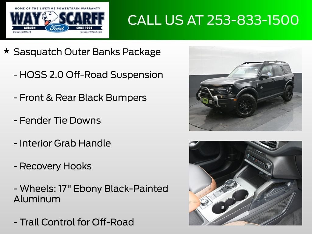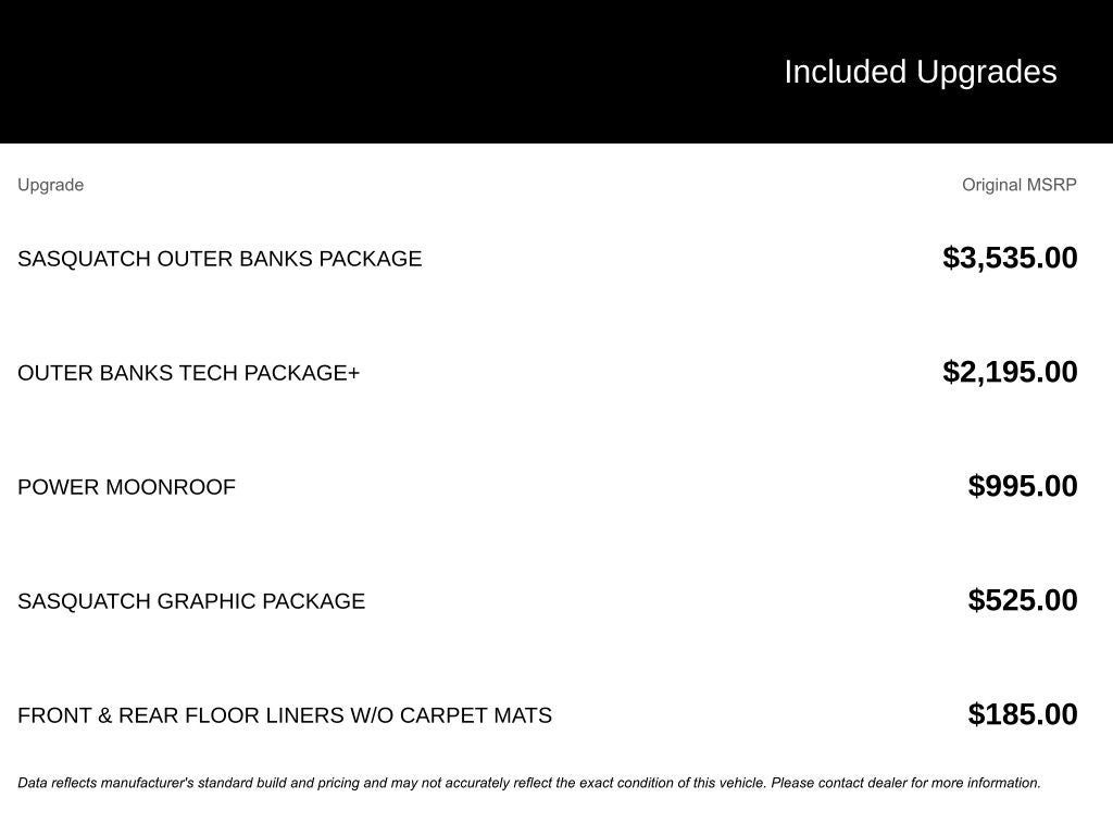 EVERY VEHICLE WE SELL COMES WITH A 5 day or 500 mile 100% money back guarantee. Not completely satisfied? No problem! Bring the car back for a for a full refund.. No questions asked. *New vehicles come with a Lifetime Limited Powertrain Warranty at NO COST to you!* (Not available on Commercial vehicles). Factory MSRP: $46,225 Dealer Discount of $1,564 off MSRP $3,564 off MSRP! 110V/400W AC Power Outlet, 2nd Row Carpeted Seatback, Automatic temperature control, Auxiliary Switches & Wiring, B&O Sound System by Bang & Olufsen, Brush Guard, Class II Trailer Tow Pack w/Trailer Sway Control, Connected Navigation, Equipment Group 300A, Fender Tie Downs, Front & Rear Black Bumpers, Front dual zone A/C, HD Radio, Heated front seats, High Clearance Fender Flares, HOSS 2.0 Off-Road Suspension, Interior Grab Handle, Outer Banks Tech Package+, Power driver seat, Power Moonroof, Power passenger seat, Rain sensing wipers, Rear window defroster, Rear window wiper, Recovery Hooks, Sasquatch Graphic Package, Sasquatch Outer Banks Package, Speed-Sensitive Wipers, Trail Control for Off-Road, Wheels: 17 Ebony Black-Painted Aluminum. 25/30 City/Highway MPG