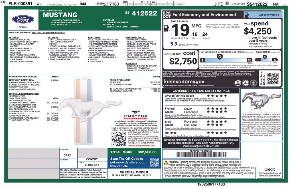 2025 Ford Mustang GT Premium Wimbledon White 5.0L V8 Ti-VCT