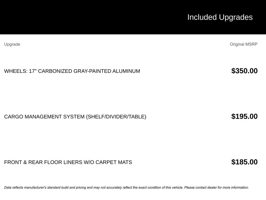 - Wheels: 17" Carbonized Gray Painted Aluminum