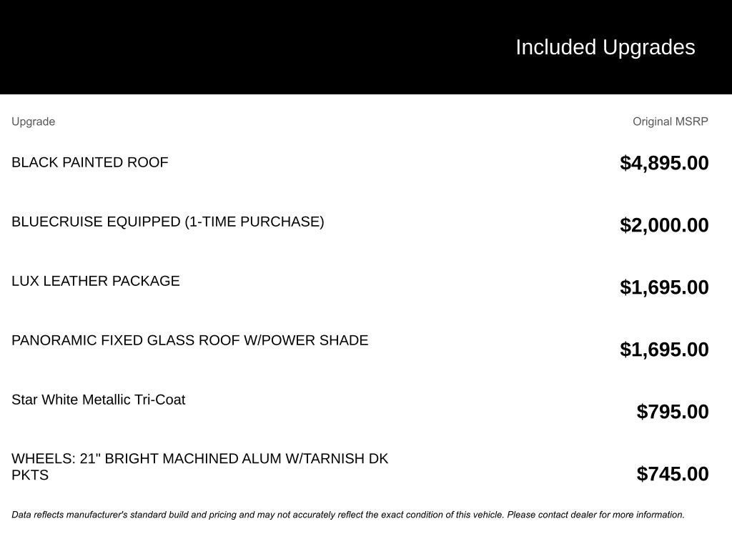 - Wheels: 21" Bright Machined Alum w/Tarnish Dk Pkts