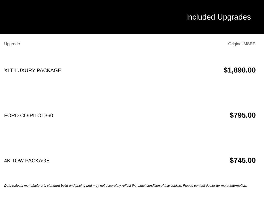 EVERY VEHICLE WE SELL COMES WITH A 5 day or 500 mile 100% money back guarantee. Not completely satisfied? No problem! Bring the car back for a for a full refund.. No questions asked. *New vehicles come with a Lifetime Limited Powertrain Warranty at NO COST to you!* (Not available on Commercial vehicles). Factory MSRP: $35,770 Dealer Discount of $789 off MSRP $1,289 off MSRP! 4K Tow Package, Apple CarPlay/Android Auto, Auto High Beams, Auto High-beam Headlights, Automatic temperature control, BLIS with Cross-Traffic Alert and Trailer Coverage, Delay-off headlights, Equipment Group 302A, Exit Warning, Exterior Parking Camera Rear, Ford Co-Pilot360, Ford Connectivity Package (1-Year Included), Fully automatic headlights, Heated Mirror with Painted Black Skull Caps, Heated Seats, Intersection Assist, Lane-Keeping System, LED Box Lighting, Power Glass Manual-Folding Mirrors, Pre-Collision Assist with Automatic Emergency Braking, Pro Power Onboard - 400W, Radio: AM/FM Stereo with 6 Speakers, Rear Cross Traffic Braking, Rear Parking Sensors, Rear-View Camera, Remote keyless entry, Remote Start System, SiriusXM with 360L, Soft Vinyl Wrapped Heated Steering Wheel, Steering wheel mounted audio controls, SYNC 4 with Enhanced Voice Recognition, Trailer Brake Controller, Trailer Hitch (class III) 2 Receiver, Unique Cloth Front Bucket Seats, Upgraded Cooling Fan, Wheels: 17 Carbonized Gray Painted Aluminum, XLT Luxury Package. 22/30 City/Highway MPG