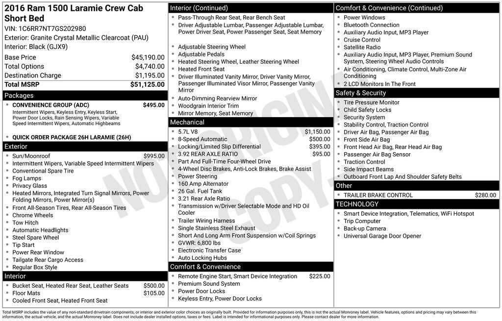 Price may not include tax title license and fees. A $200 negotiable documentary service fee may be added to the price of the vehicle. 2016 Ram 1500 Granite Crystal Metallic Clearcoat Laramie HEMI 5.7L V8 Multi Displacement VVT