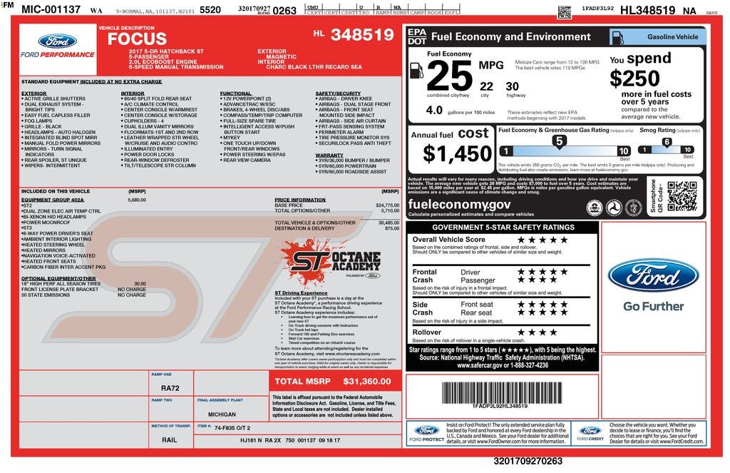 * 2017 KBB.com Brand Image Awards * 2017 KBB.com 10 Most Awarded Brands Price may not include tax title license and fees. A $200 negotiable documentary service fee may be added to the price of the vehicle. 2017 Ford Focus Magnetic ST 2.0L GTDi