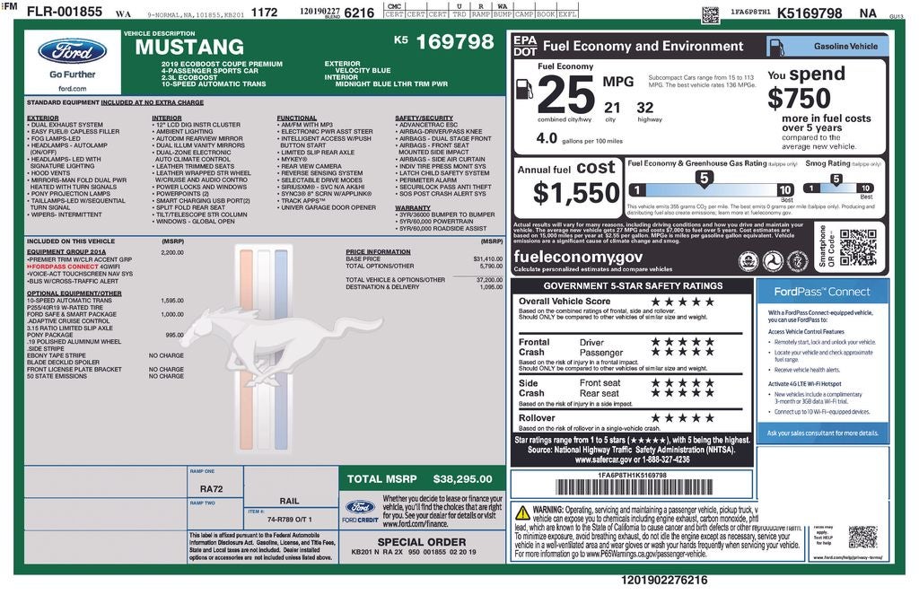 * 2019 KBB.com 10 Coolest Cars Under $30,000 Price may not include tax title license and fees. A $200 negotiable documentary service fee may be added to the price of the vehicle. 2019 Ford Mustang Velocity Blue Metallic EcoBoost Premium EcoBoost 2.3L I4 GTDi DOHC Turbocharged VCT