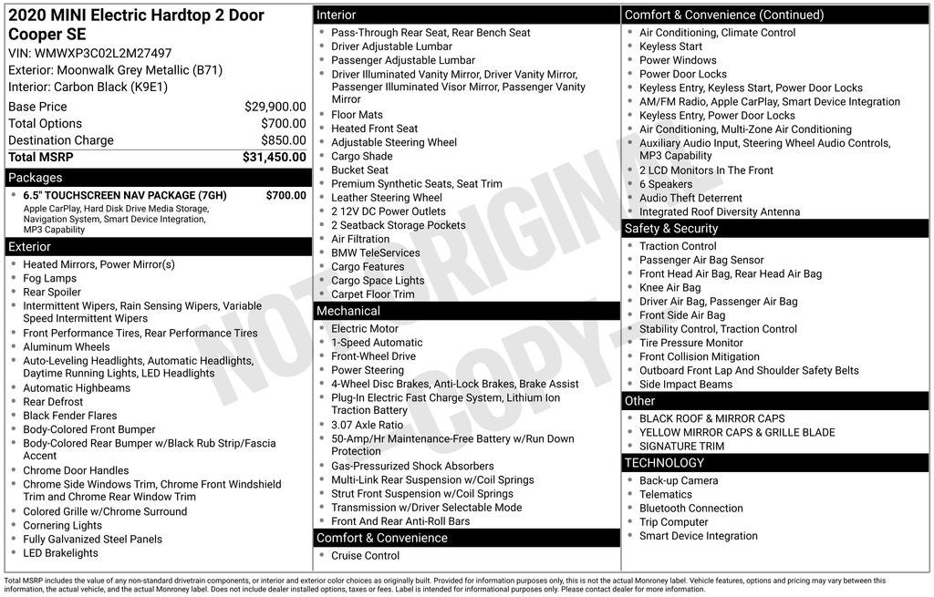 * JD Power Initial Quality Study (IQS) Price may not include tax title license and fees. A $200 negotiable documentary service fee may be added to the price of the vehicle. 2020 MINI Cooper SE Electric Moonwalk Gray Metallic Signature Electric Motor