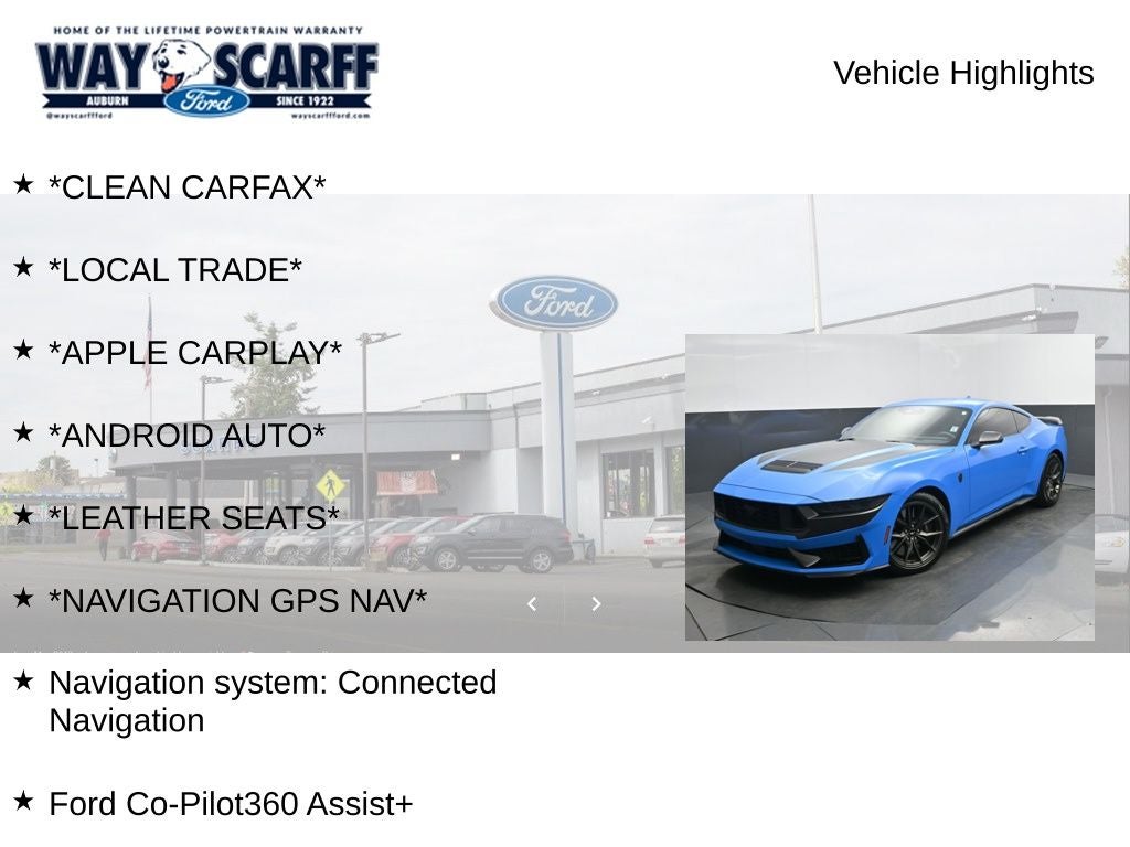 2024 Mustang Dark Horse in Grabber Blue with 500 hp V8, 10-speed auto, 700A Deluxe, NAV, B&O audio, heated/ventilated seats. Auburn, WA.